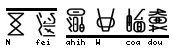 The first glyph is placed at the bottom, the second and third glyphs are placed above it, and the fourth and final glyph is placed above them all. The reading for this pattern is from bottom to up, and from right to left.